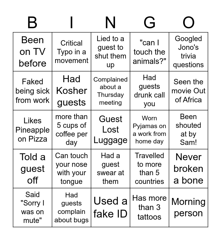 This bingo card has 32 words: Has more than 3 tattoos, Forgotten to send a movement message, more than 5 cups of coffee per day, Has a phobia of flying, Told a guest off, Had Kosher guests, Googled Jono's trivia questions, Never broken a bone, Critical Typo in a movement, Morning person, Complained about a Thursday meeting, Lied to a guest to shut them up, Seen the movie Out of Africa, Speak more than 3 languages, Worn Pyjamas on a work from home day, W24 emergency, Said "Sorry I was on mute", Likes Pineapple on Pizza, Had a guest swear at them, Can touch your nose with your tongue, Travelled to more than 5 countries, Wrong guest names in a Movement, Been shouted at by Sam!, Had guests complain about bugs, Guest Lost Luggage, "can I touch the animals?", Had guests drunk call you, Faked being sick from work, Been on TV before, Used a fake ID, Googled Jono's trivia questions and Seen the movie Out of Africa.