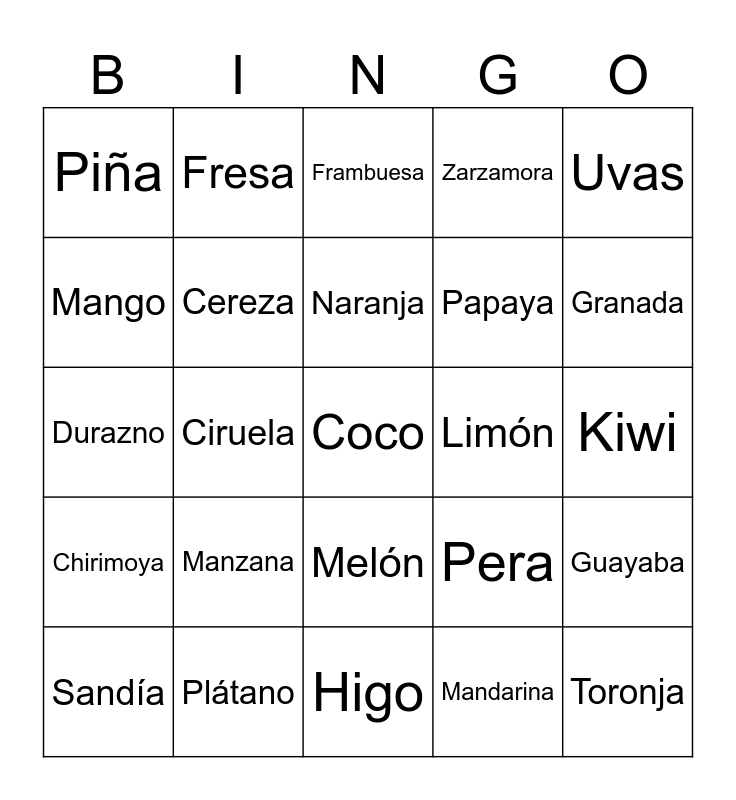 This bingo card has a free space and 24 words: Manzana, Plátano, Naranja, Sandía, Uvas, Piña, Mango, Fresa, Limón, Melón, Papaya, Durazno, Pera, Guayaba, Cereza, Mandarina, Kiwi, Frambuesa, Granada, Ciruela, Toronja, Chirimoya, Zarzamora and Higo.