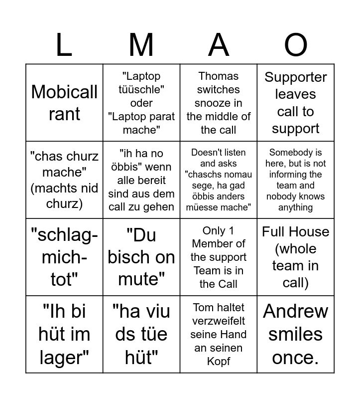 This bingo card has 16 words: "ha viu ds tüe hüt", Full House (whole team in call), Thomas switches snooze in the middle of the call, Mobicall rant, "schlag-mich-tot", "Laptop tüüschle" oder "Laptop parat mache", Only 1 Member of the support Team is in the Call, Tom haltet verzweifelt seine Hand an seinen Kopf, "chas churz mache" (machts nid churz), "ih ha no öbbis" wenn alle bereit sind aus dem call zu gehen, "Ih bi hüt im lager", Supporter leaves call to support, "Du bisch on mute", Somebody is here, but is not informing the team and nobody knows anything, Doesn't listen and asks "chaschs nomau sege, ha gad öbbis anders müesse mache" and Andrew smiles once..