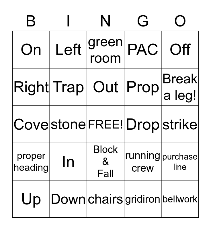 This bingo card has a free space and 24 words: In, Down, Out, Up, Off, On, Right, Left, Drop, Block & Fall, Prop, Cove, running crew, purchase line, Trap, gridiron, strike, green room, Break a leg!, stone, bellwork, proper heading, PAC and chairs.