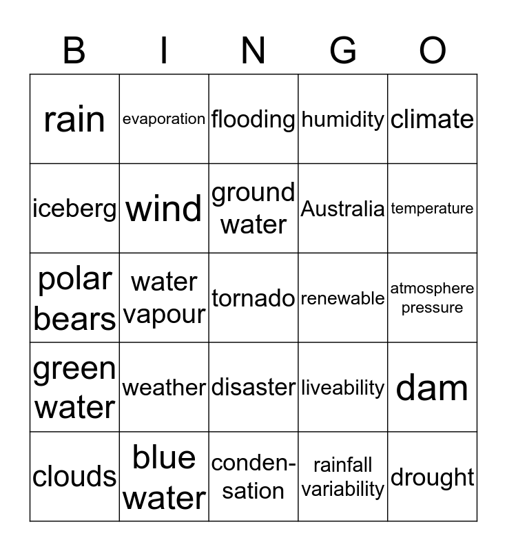 This bingo card has 25 words: weather, conden-sation, ground water, clouds, climate, rain, iceberg, evaporation, renewable, disaster, Australia, polar bears, liveability, dam, wind, drought, atmosphere pressure, flooding, temperature, water vapour, tornado, blue water, green water, humidity and rainfall variability.
