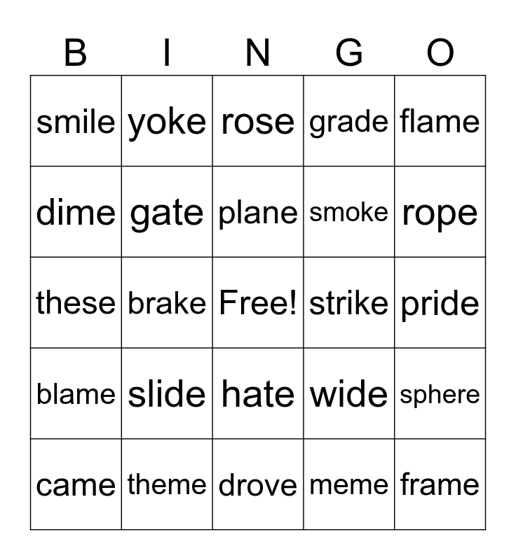 This bingo card has a free space and 39 words: name, same, cake, gate, came, hate, plane, flake, flame, blame, brake, grade, frame, pride, strike, slide, tribe, smile, crime, wide, dime, drove, smoke, rope, scope, spoke, woke, close, poke, yoke, tone, nose, rose, theme, meme, here, sphere, these and eve.