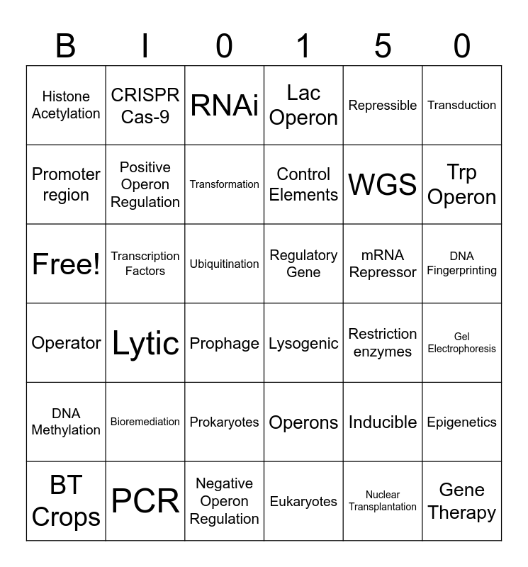 This bingo card has 36 words: Operons, Prokaryotes, Eukaryotes, Promoter region, Operator, Regulatory Gene, Positive Operon Regulation, Negative Operon Regulation, Repressible, Inducible, Trp Operon, Lac Operon, Epigenetics, Transcription Factors, Control Elements, Histone Acetylation, DNA Methylation, mRNA Repressor, Free!, RNAi, Ubiquitination, Lytic, Lysogenic, Prophage, Restriction enzymes, CRISPR Cas-9, WGS, PCR, Transformation, Transduction, Gene Therapy, BT Crops, Gel Electrophoresis, DNA Fingerprinting, Bioremediation and Nuclear Transplantation.