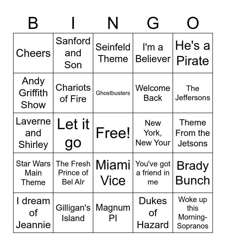 This bingo card has a free space and 36 words: Mission Impossible, Hedwig's Theme (Harry Potter), The Imperial March- Star Wars, Chariots of Fire, You've got a friend in me, Star Wars Main Theme, Ghostbusters, James Bond Theme, He's a Pirate, Cantina- Star Wars, Let it go, I'm a Believer, The Lone Ranger Theme, New York, New Your, The Jeffersons, Cheers, Love and Marriage, The Fresh Prince of Bel AIr, Woke up this Morning- Sopranos, Seinfeld Theme, Theme From the Jetsons, Brady Bunch, Gilligan's Island, I dream of Jeannie, Magnum PI, Sanford and Son, Laverne and Shirley, Hawaii 5-0, Welcome Back, Andy Griffith Show, The Beverly Hillbillies, Knight Rider, Dukes of Hazard, Miami Vice, The X-Files and Happy Days.