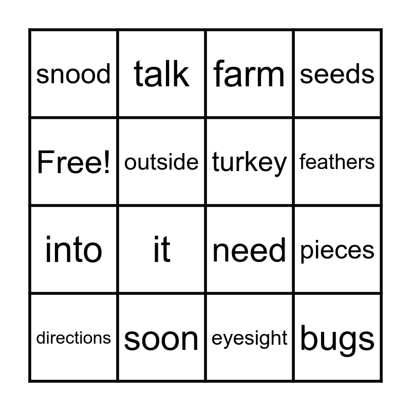 This bingo card has 39 words: bird, farmers, meat, turkey, Minnesota, poult, feathers, wings, Free!, bugs, pieces, seeds, directions, eyesight, soon, beaks, skin, snood, flock, fences, outside, food, into, it, small, many, turns, once, sound, talk, too, large, farm, their, that, different, groups, need and time.