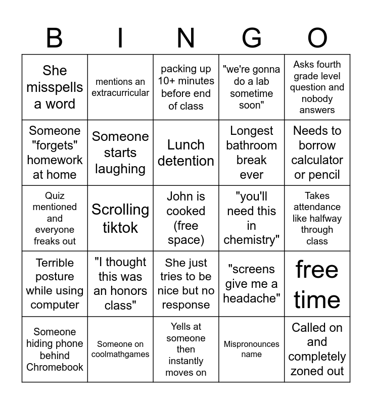 This bingo card has a free space and 24 words: "I thought this was an honors class", Someone on coolmathgames, Lunch detention, Someone hiding phone behind Chromebook, Asks fourth grade level question and nobody answers, She misspells a word, Someone "forgets" homework at home, mentions an extracurricular, "you'll need this in chemistry", She just tries to be nice but no response, Longest bathroom break ever, Quiz mentioned and everyone freaks out, "screens give me a headache", free time, Someone starts laughing, Mispronounces name, Takes attendance like halfway through class, packing up 10+ minutes before end of class, Needs to borrow calculator or pencil, Scrolling tiktok, Called on and completely zoned out, Terrible posture while using computer, "we're gonna do a lab sometime soon" and Yells at someone then instantly moves on.