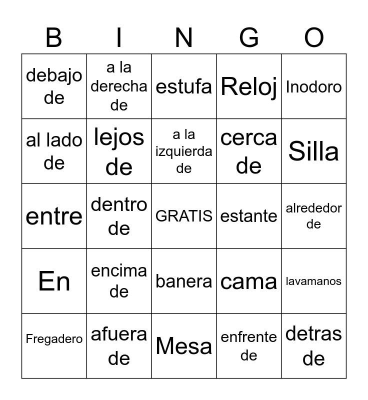 This bingo card has a free space and 24 words: encima de, afuera de, a la izquierda de, Fregadero, Inodoro, debajo de, al lado de, a la derecha de, estante, banera, cerca de, entre, cama, lavamanos, lejos de, enfrente de, alrededor de, estufa, Silla, dentro de, detras de, En, Reloj and Mesa.
