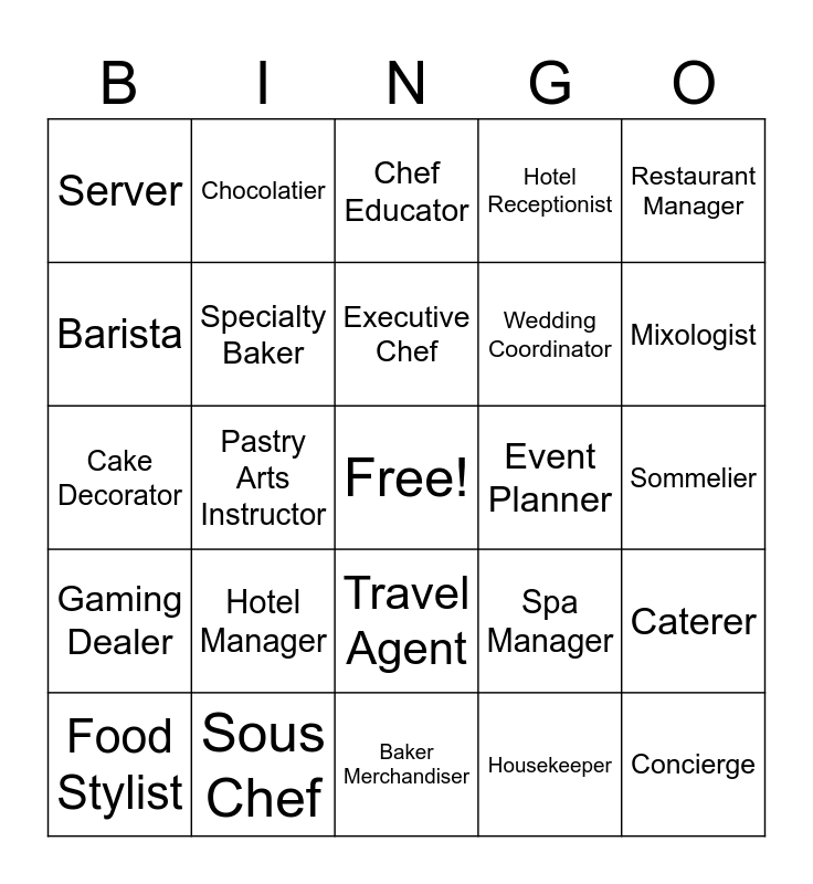 This bingo card has a free space and 24 words: Hotel Manager, Sous Chef, Executive Chef, Food Stylist, Restaurant Manager, Server, Barista, Chocolatier, Event Planner, Travel Agent, Wedding Coordinator, Cake Decorator, Spa Manager, Caterer, Specialty Baker, Housekeeper, Sommelier, Chef Educator, Mixologist, Pastry Arts Instructor, Concierge, Gaming Dealer, Hotel Receptionist and Baker Merchandiser.