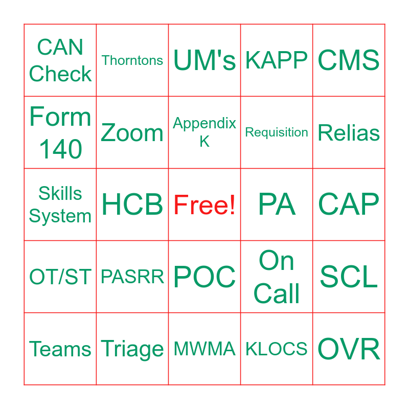 This bingo card has a free space and 31 words: MWMA, POE, HCB, Dream Team/DT, CAN Check, UM's, Zoom, On Call, PA, KLOCS, CAP, OVR, CCBHC, Ali's Alley, Relias, DMS, SCL, PASRR, OT/ST, POC, CMS, CM's, Teams, Thorntons, Requisition, Form 140, KAPP, Skills System, Triage, Appendix K and DME.
