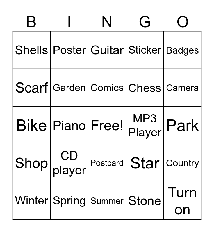 This bingo card has a free space and 29 words: Winter, Cook, Piano, TV, Shells, Guitar, Garden, CD player, MP3 Player, Spring, Park, Turn on, Summer, Stone, Camera, Autumn, Postcard, Shop, Badges, Bike, Star, Paint, Chess, Scarf, Sticker, Poster, Country, Comics and Season.