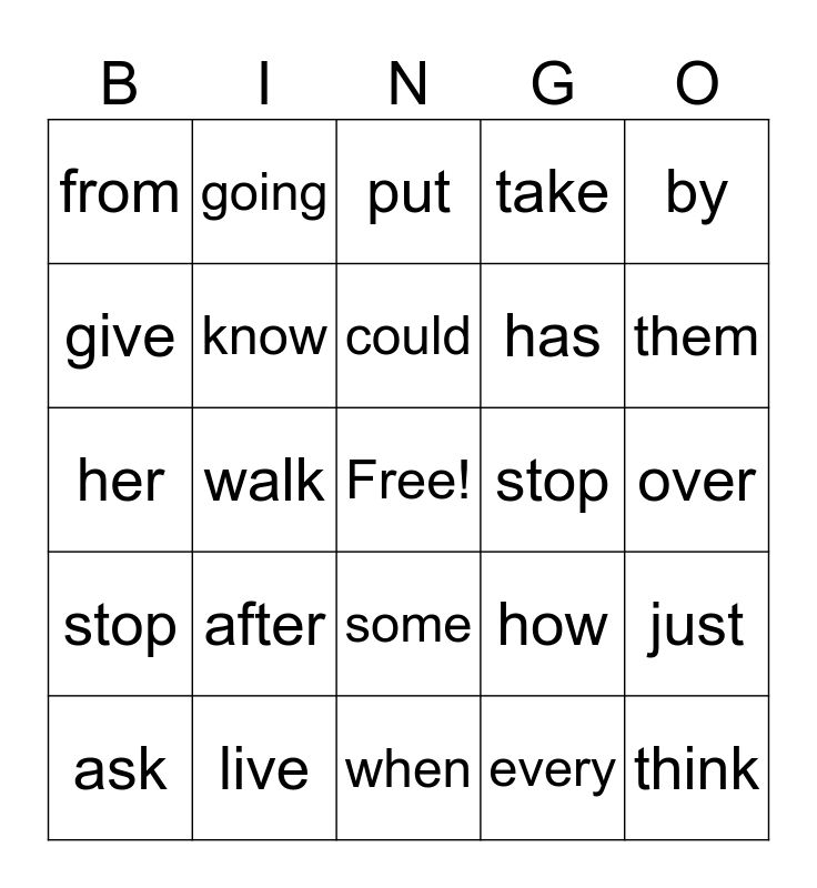 This bingo card has a free space and 24 words: after, live, could, ask, by, from, give, going, stop, some, has, her, how, just, know, every, over, put, them, walk, think, stop, take and when.