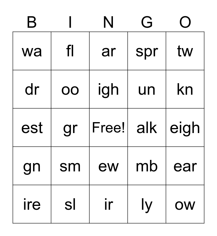 This bingo card has a free space and 107 words: ck, br, gr, sh, ch, spl, y, ay, st, pl, tr, fr, sh, th, bl, cl, fl, gl, dr, pr, sm, sc, sk, sp, cr, tw, dr, spr, scr, squ, sn, sl, str, sw, thr, ar, ch, or, ou, ow, er, ur, ir, oi, oy, oo, wor, igh, all, alk, ing, kn, gn, ang, ong, ung, ink, onk, unk, wa, a, e, o, le, ed, wh, tch, ear, old, mb, ew, est, ly, en, es, ild, ind, c, au, aw, ea, ie, ey, ph, ought, aught, g, dge, al, be, un, wr, ould, arr, air, u, ire, ful, are, tain, ure, ture, war, tion, sion, eigh and err.