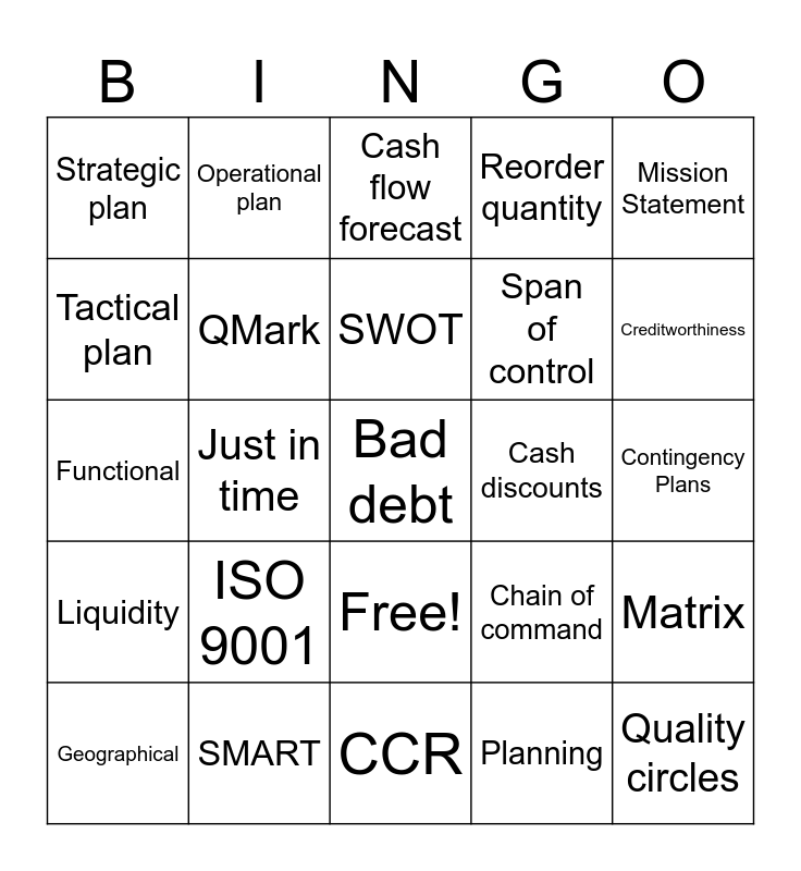 This bingo card has 26 words: Free!, Planning, SWOT, SMART, Mission Statement, Strategic plan, Tactical plan, Operational plan, Contingency Plans, Chain of command, Span of control, Functional, Matrix, Geographical, Just in time, Reorder point, Reorder quantity, Liquidity, Cash flow forecast, Bad debt, Creditworthiness, CCR, Cash discounts, ISO 9001, QMark and Quality circles.