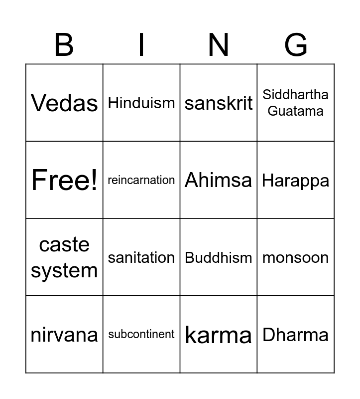 This bingo card has 16 words: subcontinent, monsoon, sanskrit, Vedas, caste system, Hinduism, Buddhism, karma, Free!, reincarnation, nirvana, Siddhartha Guatama, sanitation, Harappa, Ahimsa and Dharma.