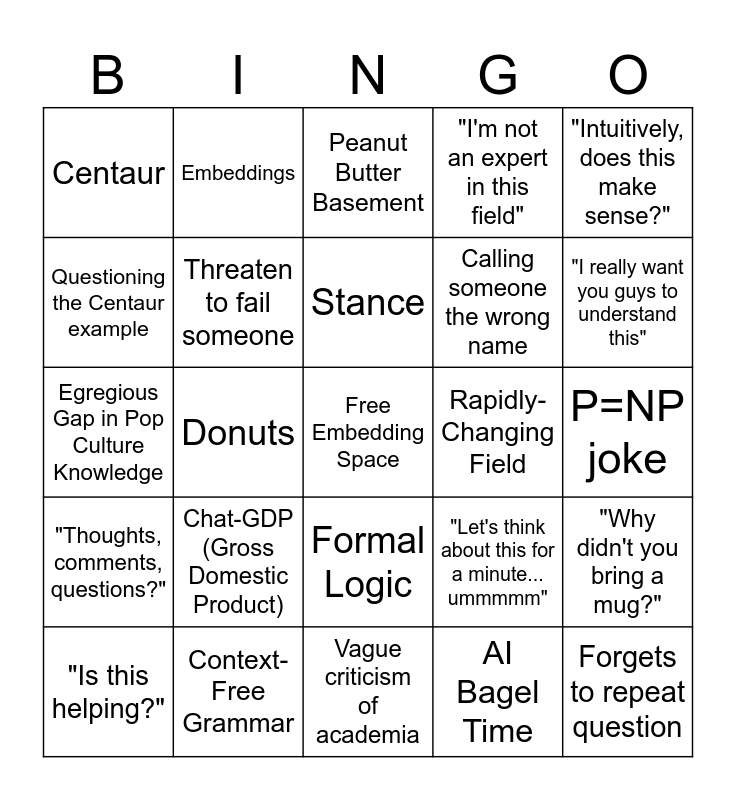 This bingo card has a free space and 24 words: Chat-GDP (Gross Domestic Product), Context-Free Grammar, Stance, "Is this helping?", "Intuitively, does this make sense?", Centaur, Questioning the Centaur example, Embeddings, Rapidly-Changing Field, Formal Logic, Calling someone the wrong name, Egregious Gap in Pop Culture Knowledge, "Let's think about this for a minute... ummmmm", "Why didn't you bring a mug?", Threaten to fail someone, AI Bagel Time, P=NP joke, Peanut Butter Basement, "I really want you guys to understand this", Donuts, Forgets to repeat question, "Thoughts, comments, questions?", "I'm not an expert in this field" and Vague criticism of academia.
