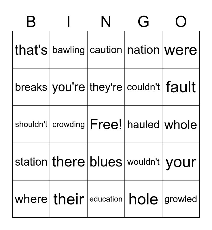 This bingo card has a free space and 24 words: there, their, they're, where, were, that's, breaks, bawling, hauled, blues, couldn't, shouldn't, wouldn't, your, you're, hole, whole, caution, fault, crowding, growled, station, nation and education.