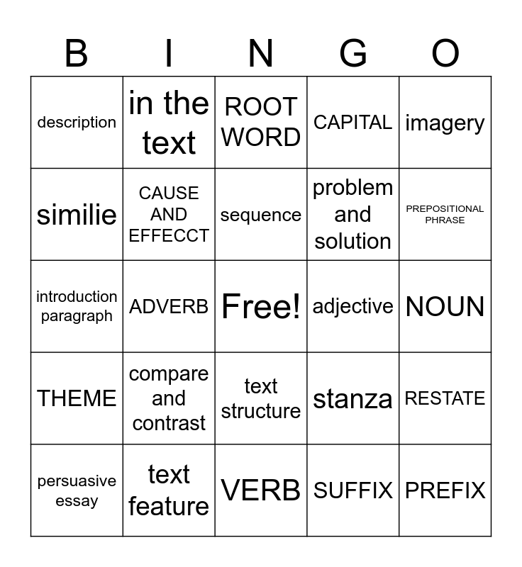 This bingo card has a free space and 24 words: compare and contrast, text feature, sequence, persuasive essay, imagery, description, similie, in the text, adjective, text structure, problem and solution, introduction paragraph, stanza, RESTATE, CAUSE AND EFFECCT, SUFFIX, NOUN, ROOT WORD, PREPOSITIONAL PHRASE, ADVERB, PREFIX, THEME, CAPITAL and VERB.