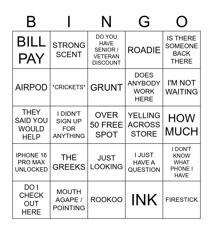 This bingo card has a free space and 24 words: THE GREEKS, MOUTH AGAPE / POINTING, GRUNT, DO I CHECK OUT HERE, IS THERE SOMEONE BACK THERE, BILL PAY, AIRPOD, STRONG SCENT, YELLING ACROSS STORE, JUST LOOKING, DOES ANYBODY WORK HERE, THEY SAID YOU WOULD HELP, I JUST HAVE A QUESTION, I DON'T KNOW WHAT PHONE I HAVE, *CRICKETS*, INK, HOW MUCH, DO YOU HAVE SENIOR / VETERAN DISCOUNT, I'M NOT WAITING, I DIDN'T SIGN UP FOR ANYTHING, FIRESTICK, IPHONE 16 PRO MAX UNLOCKED, ROADIE and ROOKOO.