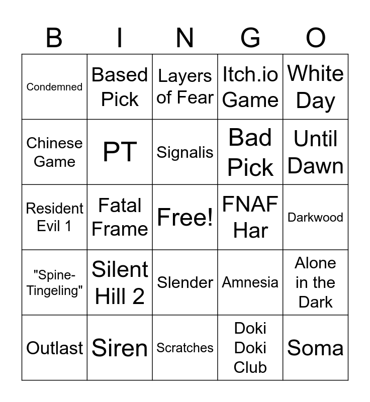 This bingo card has a free space and 24 words: Silent Hill 2, Siren, Signalis, Outlast, White Day, Condemned, Chinese Game, Based Pick, FNAF Har, Slender, Bad Pick, Resident Evil 1, Amnesia, Alone in the Dark, PT, Doki Doki Club, Darkwood, Layers of Fear, Until Dawn, Fatal Frame, Soma, "Spine-Tingeling", Itch.io Game and Scratches.