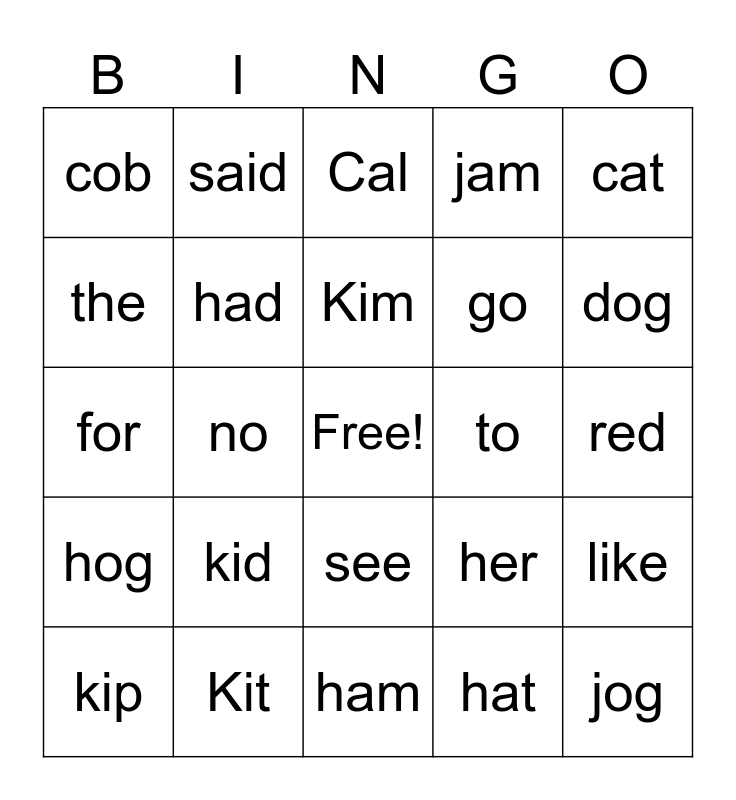 This bingo card has a free space and 24 words: kid, Kit, Kim, kip, cat, cob, the, said, to, see, go, for, her, like, had, hat, red, Cal, dog, no, jog, hog, jam and ham.