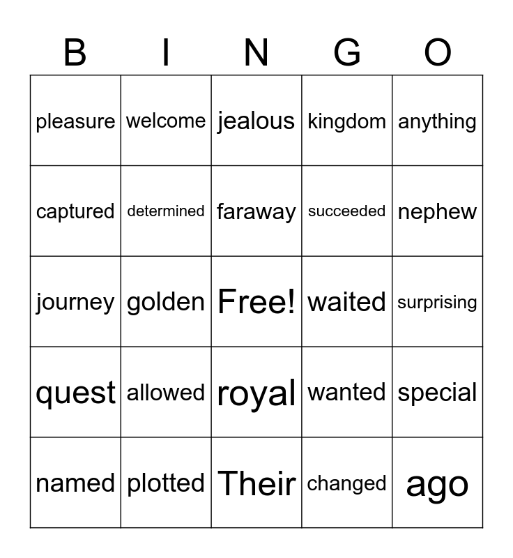 This bingo card has a free space and 43 words: ancient, ago, They, named, family, changed, jealous, brother, anything, plotted, kingdom, waited, royal, allowed, forever, Their, throne, journey, uncle, nephew, welcome, stranger, dinner, pleasure, thinking, surprising, question, suppose, wanted, quest, impossible, special, treasure, golden, breathing, dragon, guarded, faraway, captured, succeeded, challenge, determined and survived.