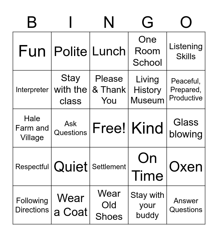 This bingo card has a free space and 24 words: Quiet, Wear a Coat, Please & Thank You, Following Directions, Listening Skills, Fun, Interpreter, Polite, Kind, Settlement, Living History Museum, Hale Farm and Village, On Time, Oxen, Stay with the class, Stay with your buddy, Glass blowing, Lunch, Peaceful, Prepared, Productive, Ask Questions, Answer Questions, Respectful, One Room School and Wear Old Shoes.
