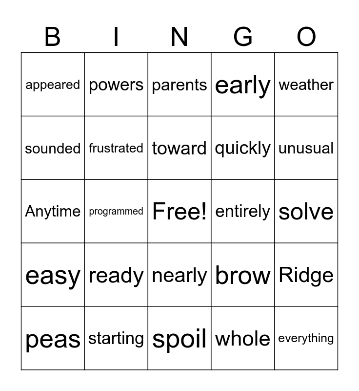 This bingo card has a free space and 43 words: anniversary, everything, roast, peas, hour, whole, parents, together, weather, starting, early, entirely, nearly, ready, It'll, spoil, aware, Anytime, anywhere, unusual, powers, uncanny, plight, appeared, light, solve, thinking, rubbing, brow, easy, punched, Ridge, amazing, programmed, watching, scene, started, toward, sounded, quickly, remembered, frustrated and bawl.
