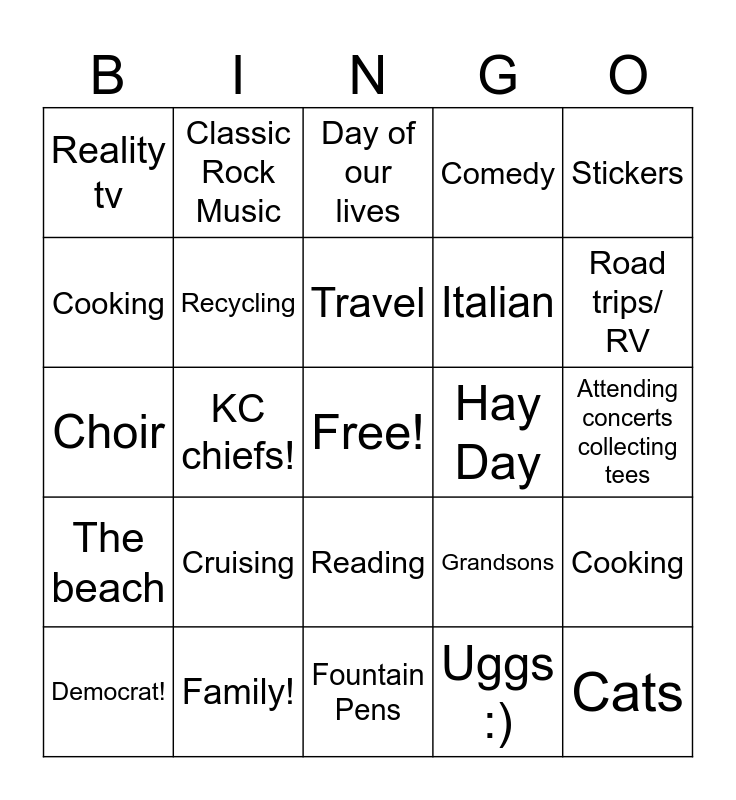 This bingo card has a free space and 24 words: Cruising, Family!, Travel, Democrat!, Stickers, Reality tv, Cooking, Classic Rock Music, Hay Day, Reading, Italian, Choir, Grandsons, Cooking, Recycling, Uggs :), Attending concerts collecting tees, Day of our lives, Road trips/ RV, KC chiefs!, Cats, The beach, Comedy and Fountain Pens.
