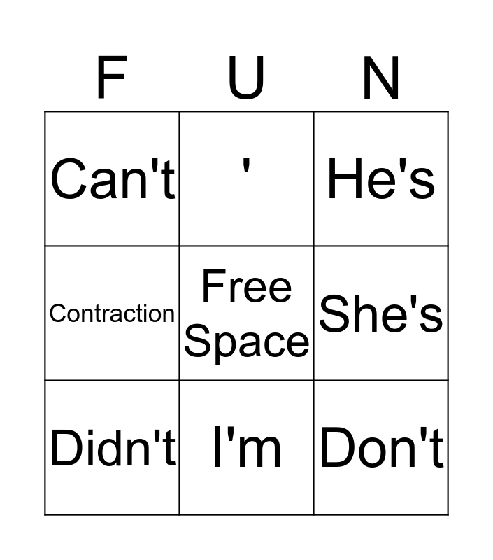 This bingo card has a free space and 8 words: She's, He's, ', Didn't, Can't, Don't, Contraction and I'm.