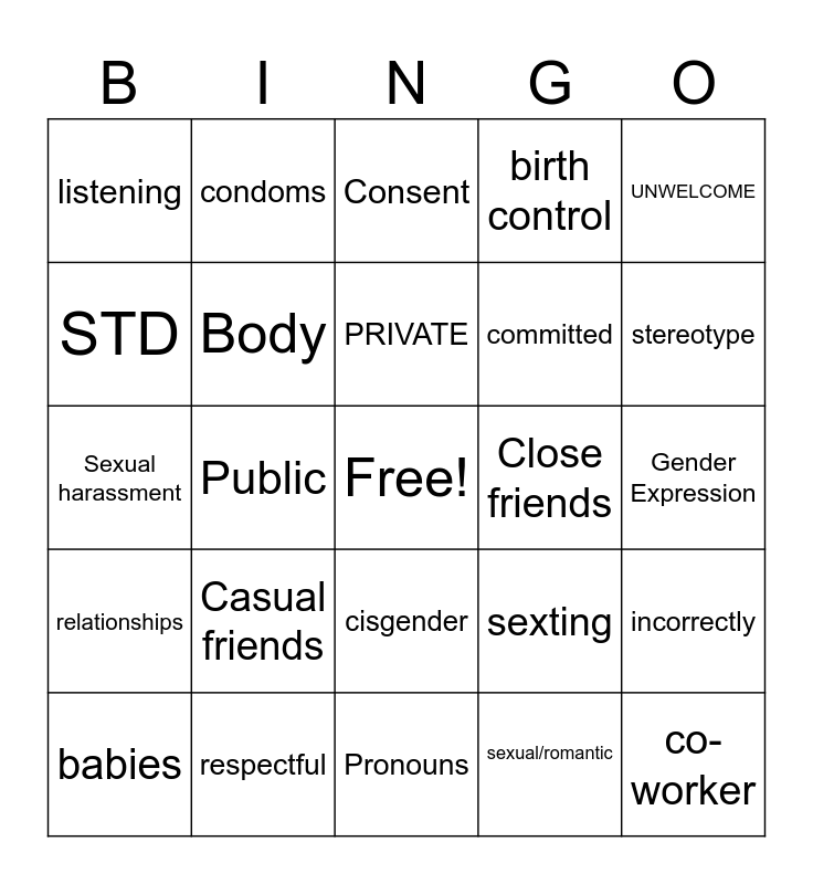 This bingo card has a free space and 29 words: babies, oversharing, Public, hearing, listening, Consent, Body, Casual friends, Close friends, respectful, Gender Expression, co-worker, Pronouns, sexual/romantic, stereotype, transgender, cisgender, relationships, UNWELCOME, Sexual harassment, sexting, minor, committed, STD, birth control, condoms, incorrectly, PRIVATE and social media.
