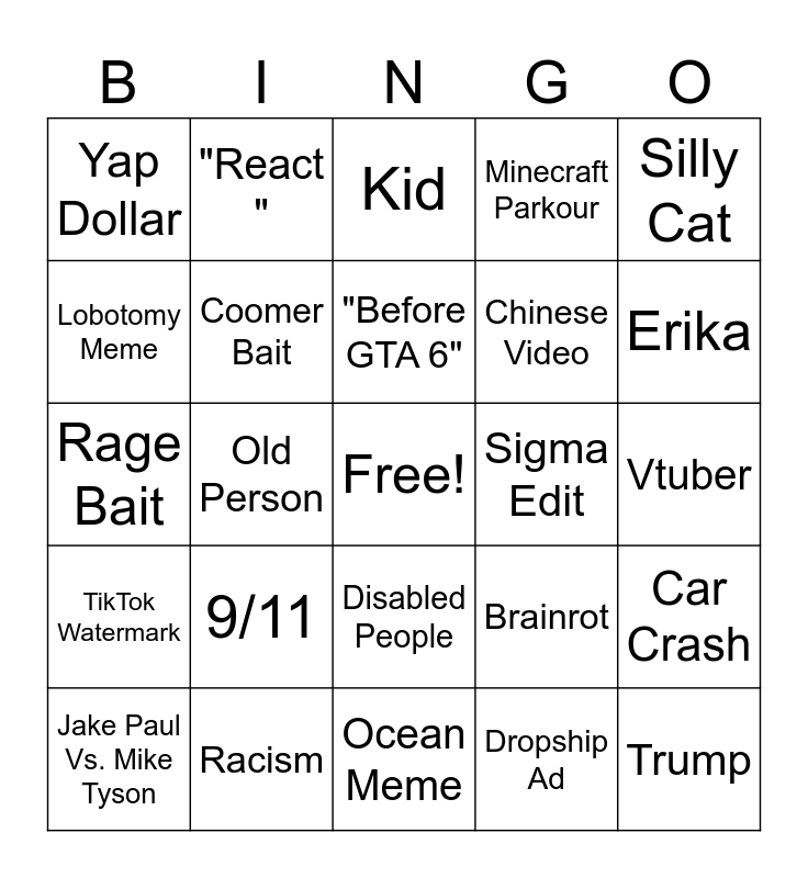This bingo card has a free space and 24 words: 9/11, Racism, "Before GTA 6", Jake Paul Vs. Mike Tyson, Silly Cat, Yap Dollar, Lobotomy Meme, "React ", Sigma Edit, Disabled People, Chinese Video, Rage Bait, Brainrot, Car Crash, Coomer Bait, Dropship Ad, Vtuber, Kid, Erika, Old Person, Trump, TikTok Watermark, Minecraft Parkour and Ocean Meme.