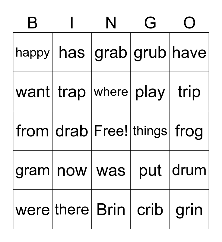 This bingo card has a free space and 24 words: now, there, where, were, have, happy, want, has, things, was, play, from, put, drum, trap, crib, frog, grab, trip, drab, grin, gram, grub and Brin.