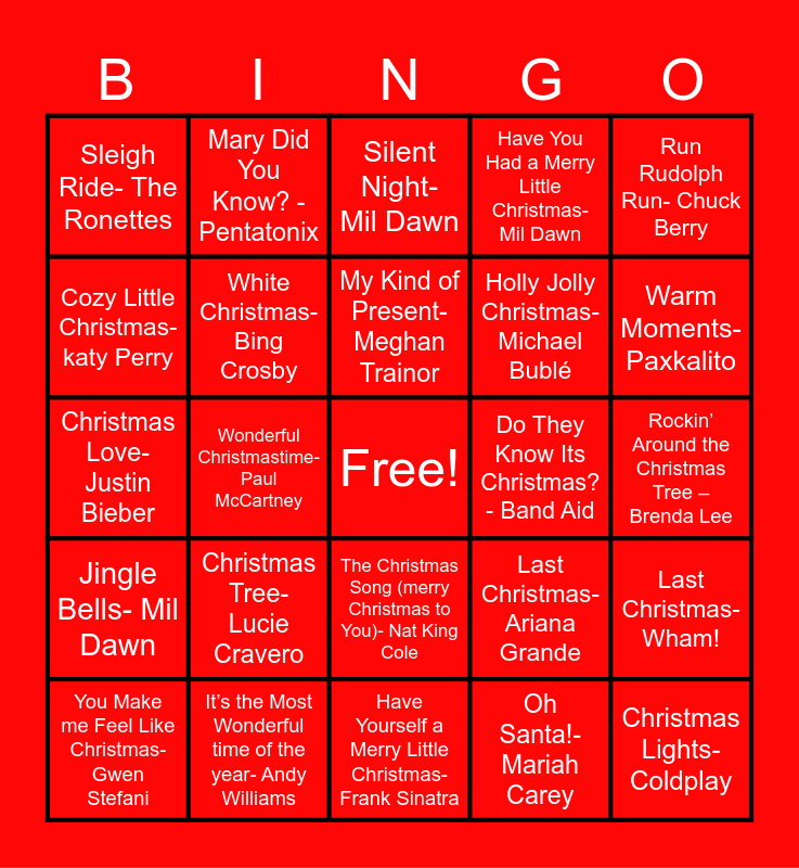 This bingo card has a free space and 70 words: Jingle Bell Rock- Bobby Helms, Rockin’ Around the Christmas Tree – Brenda Lee, All I want for Christmas is You – Mariah Carey, Mistletoe- Justin Bieber, It’s the Most Wonderful time of the year- Andy Williams, Let it Snow! Let it Snow! Let it Snow!- Dean Martin, Have You Had a Merry Little Christmas- Mil Dawn, Underneath the Tree- Kelly Clarkson, Run Rudolph Run- Chuck Berry, It’s the Most Wonderful Time of the Year- Andy Williams, Last Christmas- Wham!, Snowman- Sia, Sleigh Ride- The Ronettes, Silent Night- Mil Dawn, Happy Christmas (War is Over)- John Lenon, Wonderful Christmastime- Paul McCartney, The Christmas Song (merry Christmas to You)- Nat King Cole, Holly Jolly Christmas- Michael Bublé, Feliz Navidad- Jose Feliciano, Jingle Bells- Mil Dawn, Do They Know Its Christmas? - Band Aid, Last Christmas- Ariana Grande, Warm Moments- Paxkalito, Christmas (Baby Please Come Home)- Darlene Love, Christmas Tree Farm- Taylor Swift, Santa Tell Me- Ariana Grande, White Christmas- Lvnt, A Holly Jolly Christmas- Burl Ives, Oh Santa!- Mariah Carey, Merry Christmas- Ed Sheeran, Mary Did You Know? - Pentatonix, Santa Claus is Coming to Town- Jackson 5, Like It’s Christmas- Jonas Brothers, Santa’s Coming for Us- Sia, Let it Snow- Softy, Winter Things- Ariana Grande, Have Yourself a Merry Little Christmas- Sam Smith, Christmas Don’t be Late- Mil dawn, Christmas (baby please come home)- Mariah carey, Cozy Little Christmas- katy Perry, Carol of the Bells- Peter J Whilhousky, Christmas Tree- Lucie Cravero, Christmas Lights- Coldplay, This Christmas- Donny Hathaway, Santa Baby- Kylie Minogue, White Christmas- Bing Crosby, You Make me Feel Like Christmas- Gwen Stefani, Here Comes Santa Claus- Elvis Presley, Christmas Without You- Ava Max, Baby its cold Outside- Idina Menzel & Michael Bublé, All I Want for Christmas – Liam Payne, The First Noel- NOVA PRAISE, The Christmas Song- Shawn Mendes, Make It to Christmas- Alessia Cara, Have Yourself a Merry Little Christmas- Frank Sinatra, Blue Christmas- Elvis Presley, My Kind of Present- Meghan Trainor, Run Rudolph Run- Chuck Berry, I’ll be Home for Christmas- Michael Bublé, Shake Up Christmas- Train, Christmas Love- Justin Bieber, Santa’s Station- Jam’addict, Have Yourself a Merry Little Christmas- Lvnt, Mery Christmas, Happy Holidays- NSYNC, Let it Snow!- Frank Sinatra, I Need you Christmas- Jonas Brothers, Baby its Cold Outside- Brett Eldredge, Here Comes Santa Claus- Gene Autry, Santa Claus is Comin’ to Town- Lawrence, Stolen Jars and December Dreams-Tibeauthetraveler.