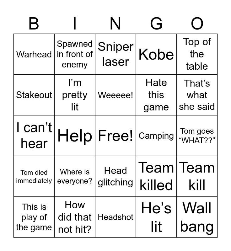 This bingo card has a free space and 24 words: Where is everyone?, How did that not hit?, Weeeee!, This is play of the game, Top of the table, Warhead, Stakeout, Spawned in front of enemy, Camping, Head glitching, Hate this game, I can’t hear, Team killed, Team kill, I’m pretty lit, He’s lit, Tom goes “WHAT??”, Sniper laser, That’s what she said, Help, Wall bang, Tom died immediately, Kobe and Headshot.