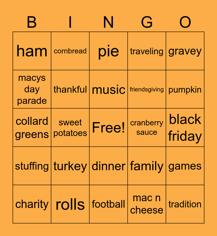 This bingo card has a free space and 24 words: turkey, rolls, music, charity, gravey, ham, macys day parade, cornbread, cranberry sauce, dinner, friendsgiving, collard greens, family, games, thankful, mac n cheese, black friday, pie, pumpkin, sweet potatoes, tradition, stuffing, traveling and football.