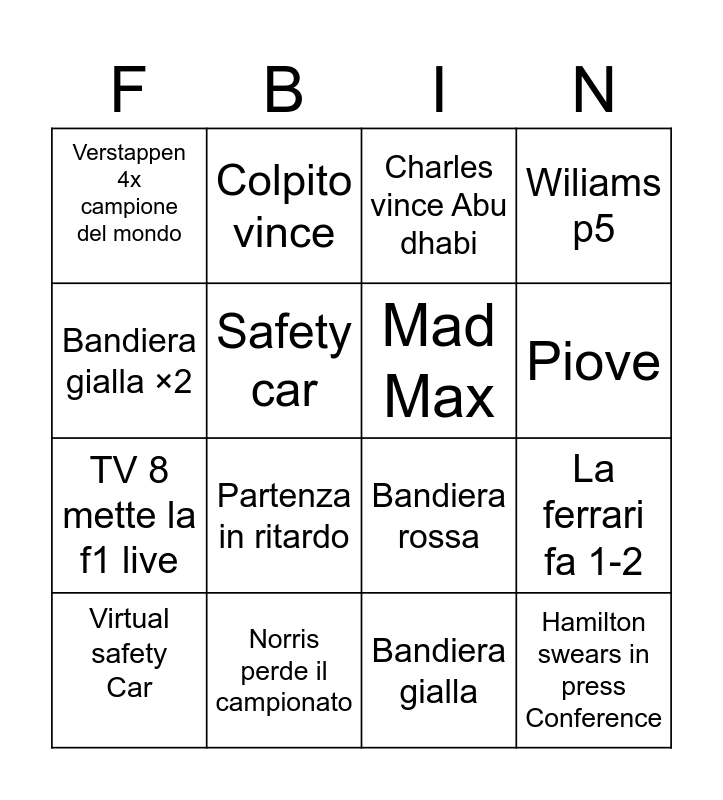 This bingo card has 16 words: Norris perde il campionato, La ferrari fa 1-2, Charles vince Abu dhabi, Verstappen 4x campione del mondo, TV 8 mette la f1 live, Colpito vince, Bandiera rossa, Bandiera gialla, Bandiera gialla ×2, Safety car, Virtual safety Car, Wiliams p5, Partenza in ritardo, Piove, Mad Max and Hamilton swears in press Conference.