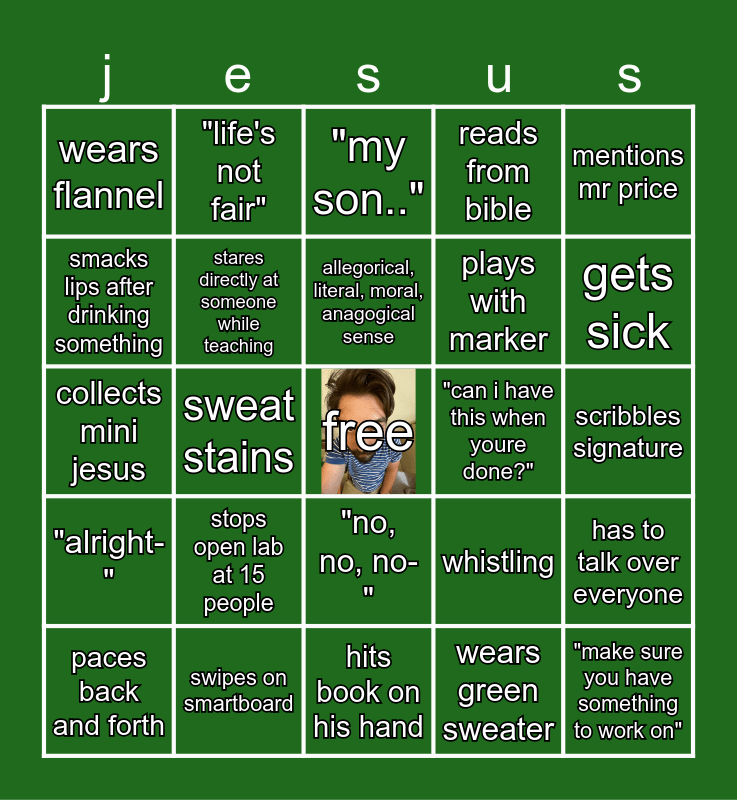 This bingo card has a free space and 44 words: coffee cup, "make sure you have something to work on", mimics something/ someone, paces back and forth, "my wife..", wears green sweater, "my son..", mentions his babydolls, mentions mr price, swipes on smartboard, reads from bible, "can i have this when youre done?", "no, no, no-", stops open lab at 15 people, plays video in class, hits book on his hand, mentions horror director, collects mini jesus, chews on pen, gets sick, "life's not fair", "um..", taps on his ipad, wears flannel, "God says..", scribbles signature, disappears during open lab, refills coffee cup during class, whistling, "alright-", "lets start with a prayer", has to talk over everyone, any variation of the word "so" ex: so, and so, etc., gets annoyed when he has to go back, sweat stains, gets bullied by class/open lab, talks to mrs. fitzpatrick or mrs. stewart, "i'll explain it to you", allegorical, literal, moral, anagogical sense, smacks lips after drinking something, plays with marker, "but-", stares directly at someone while teaching and carries Bible around everywhere.