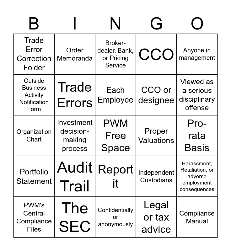 This bingo card has a free space and 24 words: Audit Trail, The SEC, Each Employee, PWM's Central Compliance Files, Anyone in management, Trade Error Correction Folder, Outside Business Activity Notification Form, Order Memoranda, Proper Valuations, Report it, CCO or designee, Organization Chart, Independent Custodians, Harassment, Retaliation, or adverse employment consequences, Trade Errors, Legal or tax advice, Pro-rata Basis, Broker-dealer, Bank, or Pricing Service, Viewed as a serious disciplinary offense, Investment decision-making process, Compliance Manual, Portfolio Statement, CCO and Confidentially or anonymously.