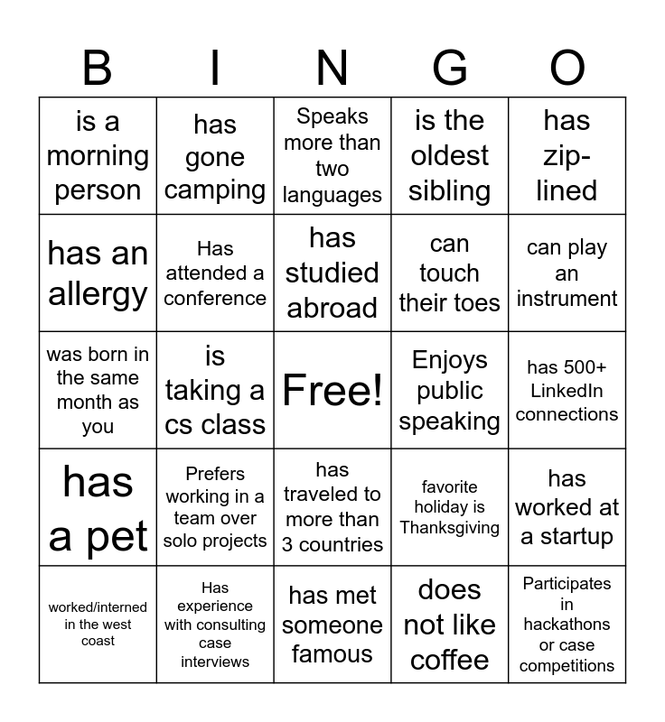 This bingo card has a free space and 29 words: worked/interned in the west coast, has a side hustle, is taking a cs class, has 0 unread emails, is a morning person, Speaks more than two languages, Has attended a conference, Prefers working in a team over solo projects, Enjoys public speaking, Has experience with consulting case interviews, has 500+ LinkedIn connections, Participates in hackathons or case competitions, has met someone famous, does not like coffee, can play an instrument, is left handed, has traveled to more than 3 countries, has a pet, has zip-lined, was born in the same month as you, favorite holiday is Thanksgiving, has broken a bone, can touch their toes, has an allergy, is the oldest sibling, has gone camping, has worked at a startup, has studied abroad and loves listening to podcasts.