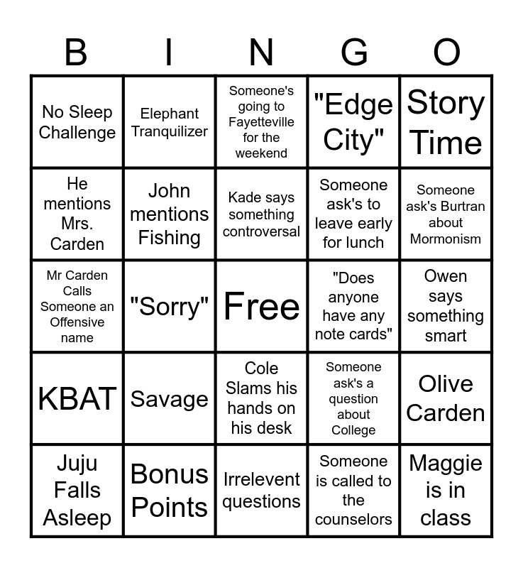 This bingo card has a free space and 39 words: Burtran Laughs, Bella Makes a Weird Noise, Bel is referred as "Hitler", John mentions Fishing, Juju Falls Asleep, Cole Slams his hands on his desk, Kade says something controversal, Juju and Cole argue, Story Time, KBAT, "Sorry", "Edge City", Maggie is in class, Owen says something smart, "Does anyone have any note cards", Savage, Quiz, No Sleep Challenge, "Who has a good thing", Someone ask's a question about College, He mentions Mrs. Carden, Irrelevent questions, Someone ask's to leave early for lunch, Someone ask's Burtran about Mormonism, The Jets, Give your all today & tomorrow (GYATT), Take it to Tyndall (TITT), He mentions Defense Contracting, Panther Sounds, Elephant Tranquilizer, Mr. Carden plays questionable music, Mr. Carden Talks about Food, Someone's going to Fayetteville for the weekend, Bonus Points, Someone is called to the counselors, Japan, Olive Carden, Mr Carden Calls Someone an Offensive name and Gage says something out of pocket.