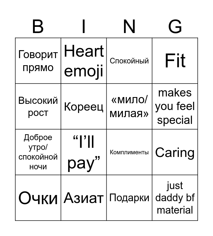 This bingo card has 16 words: Азиат, Caring, Спокойный, Говорит прямо, Доброе утро/спокойной ночи, Heart emoji, Комплименты, Подарки, Высокий рост, Кореец, Очки, Fit, “I’ll pay”, makes you feel special, «мило/милая» and just daddy bf material.