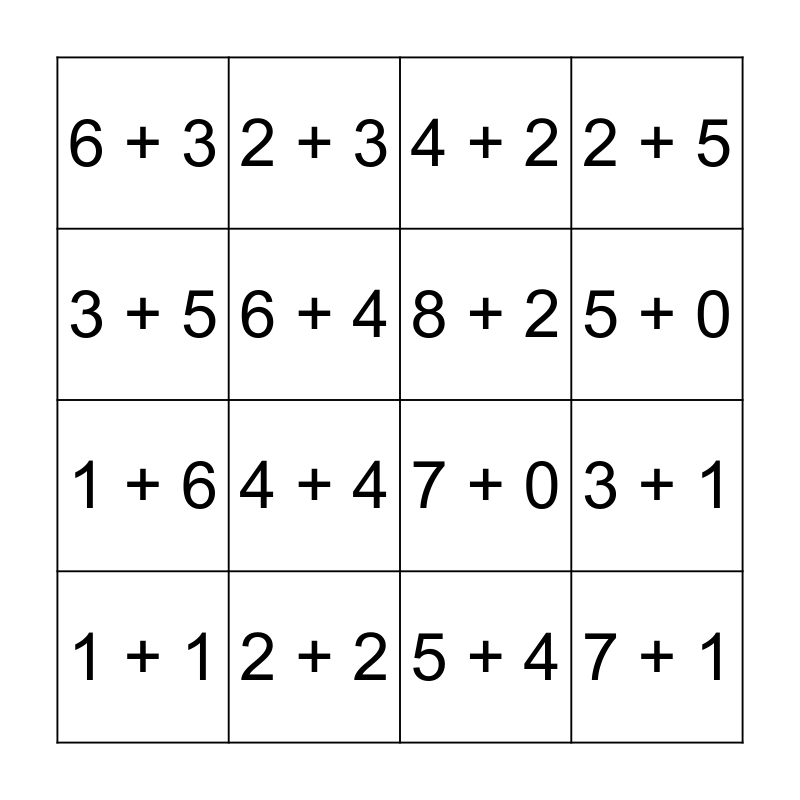 This bingo card has 16 words: 2 + 2, 3 + 1, 4 + 2, 6 + 3, 1 + 6, 2 + 3, 7 + 0, 5 + 4, 3 + 5, 6 + 4, 1 + 1, 2 + 5, 4 + 4, 5 + 0, 8 + 2 and 7 + 1.