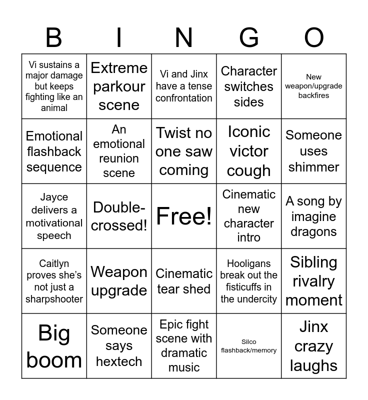 This bingo card has a free space and 24 words: Weapon upgrade, Someone says hextech, Twist no one saw coming, Big boom, New weapon/upgrade backfires, Vi sustains a major damage but keeps fighting like an animal, Emotional flashback sequence, Extreme parkour scene, Cinematic new character intro, Cinematic tear shed, Iconic victor cough, Jayce delivers a motivational speech, Hooligans break out the fisticuffs in the undercity, Sibling rivalry moment, An emotional reunion scene, Silco flashback/memory, A song by imagine dragons, Vi and Jinx have a tense confrontation, Someone uses shimmer, Double-crossed!, Jinx crazy laughs, Caitlyn proves she’s not just a sharpshooter, Character switches sides and Epic fight scene with dramatic music.