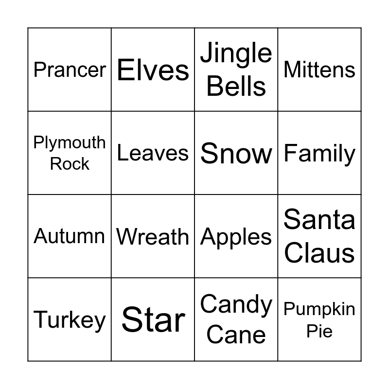 This bingo card has 20 words: Santa Claus, Pumpkins, Jingle Bells, Pere Noel, Turkey, Plymouth Rock, Star, Prancer, Autumn, Elves, Wreath, Apples, Leaves, Pumpkin Pie, Snow, Cranberries, Family, Mittens, Candy Cane and Sleigh.