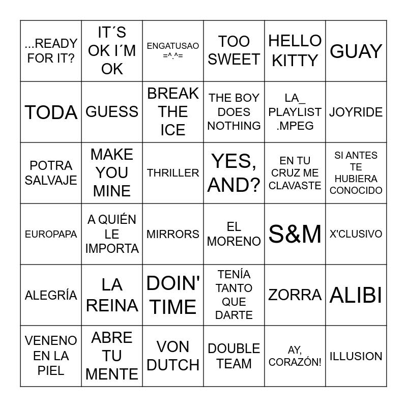 This bingo card has 72 words: PIRULÍ, IT´S OK I´M OK, JOYRIDE, AY, CORAZÓN!, BÉSAME, OYE, TOO SWEET, A TODA MECHA, BREAK THE ICE, TEQUILA, MIRRORS, LIVING YOUR DREAMS, THE BOY DOES NOTHING, ...READY FOR IT?, QUE NADA NOS PARE (LO MÁS IMPORTANTE), LA_ PLAYLIST .MPEG, EUROPAPA, HELLO KITTY, DIRRTY, THRILLER, EN TU CRUZ ME CLAVASTE, POTRA SALVAJE, A QUIÉN LE IMPORTA, TENÍA TANTO QUE DARTE, VENENO EN LA PIEL, SHE BANGS, EL BAILE DEL PESCAO, DIVA, ABRE TU MENTE, BROTHER LOUIE, EL MORENO, LA_ ORIGINAL .MP3, YO TENGO UN NOVIO, PERDIÓ ESTE CULO, X'CLUSIVO, DOUBLE TEAM, GATA ONLY, EL PANTALON, GUAY, ALIBI, SI ANTES TE HUBIERA CONOCIDO, ALEGRÍA, SOLTERA, CALIENTE, LITURGIA, YES, AND?, ZORRA, KOMBOLEWA, LOVE ON, VON DUTCH, ILLUSION, ESPRESSO, I LIKE THE WAY YOU KISS ME, MAKE YOU MINE, LA REINA, COMO EN UN DRAMA ITALIANO, ENGATUSAO =^.^=, GUESS, NEW WOMAN, DIE WITH A SMILE, CARITA TRISTE, OMEGA, DOIN' TIME, S&M, FIEBRE, MANEATER, TODA, WORTH IT, PERROS SALVAJES, ROSAS, TELEPHONE and COZY.