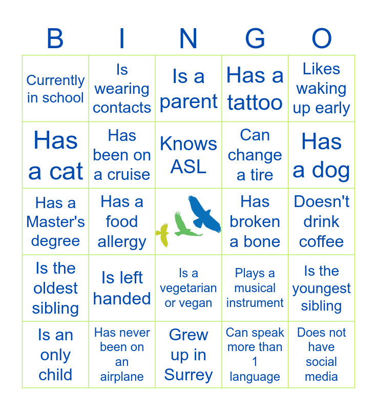 This bingo card has a free space and 24 words: Is left handed, Has never been on an airplane, Knows ASL, Is an only child, Likes waking up early, Currently in school, Has a cat, Is wearing contacts, Has broken a bone, Is a vegetarian or vegan, Can change a tire, Has a Master's degree, Plays a musical instrument, Is the youngest sibling, Has been on a cruise, Can speak more than 1 language, Doesn't drink coffee, Is a parent, Has a dog, Has a food allergy, Does not have social media, Is the oldest sibling, Has a tattoo and Grew up in Surrey.