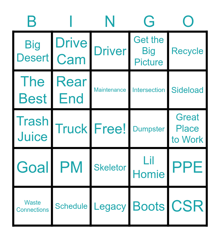 This bingo card has a free space and 57 words: Southwest Disposal, Waste Connections, Central Region, Big Desert, Legacy, Backing, Rear End, Roll Over, Intersection, Aim High, Get the Big Picture, Keep Your Eyes Moving, Leave Yourself an Out, Make Sure They See You, Trash, Garbage, Recycle, Truck, Mechanic, CSR, Dumpster, Cart, Lil Homie, Driver, Operations, Maintenance, Stop Service, Frontload, Sideload, Rearload, Roll Off, Safety, Integrity, Customer Service, Great Place to Work, The Best, Swivel, Trash Juice, I-rate, Goal, Drive Cam, Skeletor, Overfilled, Not Out, Tagged, Blocked, PM, Schedule, Shop, Office, High Viz, Boots, Vest, Bay, Safety Meeting, PPE and Smith System.