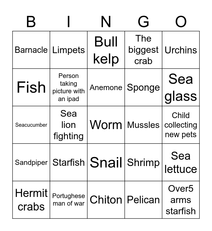 This bingo card has 25 words: Starfish, Chiton, Anemone, Hermit crabs, Urchins, Barnacle, Fish, Limpets, Mussles, Snail, Sponge, Seacucumber, Shrimp, Sea lettuce, Person taking picture with an ipad, Over5 arms starfish, Child collecting new pets, Bull kelp, Sea glass, Sea lion fighting, Worm, Portughese man of war, Sandpiper, The biggest crab and Pelican.