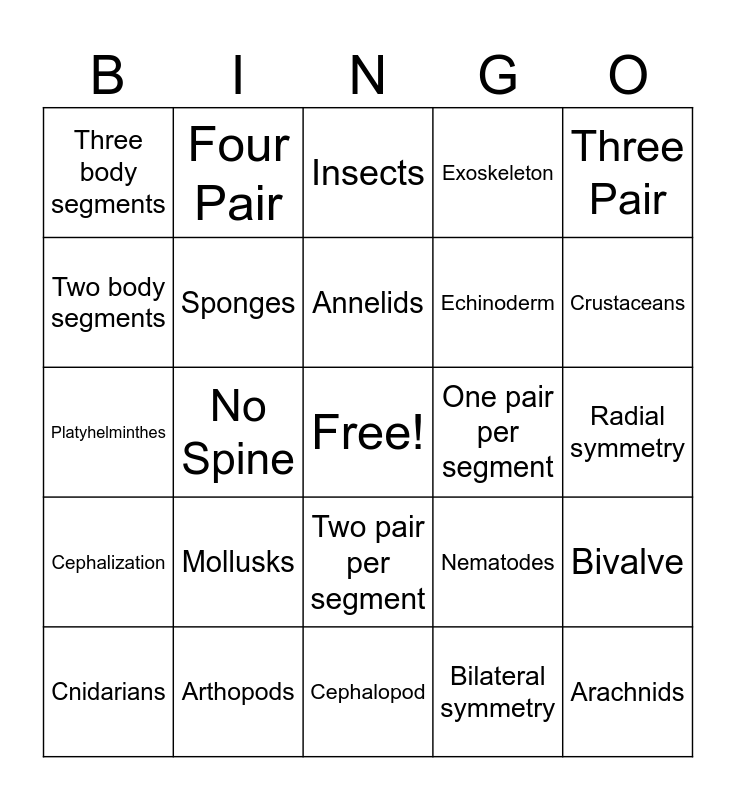 This bingo card has a free space and 24 words: Mollusks, Arthopods, Annelids, Cnidarians, Three Pair, Three body segments, Two body segments, Four Pair, One pair per segment, Two pair per segment, Echinoderm, Platyhelminthes, Nematodes, Bivalve, Sponges, Bilateral symmetry, Radial symmetry, Insects, Crustaceans, No Spine, Arachnids, Cephalization, Exoskeleton and Cephalopod.
