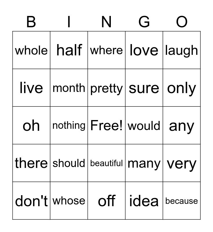 This bingo card has a free space and 26 words: beautiful, idea, pretty, whose, laugh, whole, live, half, any, many, sure, oh, very, don't, nothing, saw, love, there, where, because, only, off, would, should, month and once.